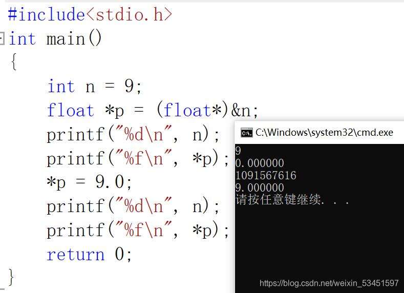 #include<stdio.h>int main(){int n = 9;float *p = (float*)&n;printf("%d\n", n);printf("%f\n", *p);*p = 9.0;printf("%d\n", n);printf("%f\n", *p);return 0;}如果你的答案是9 9.000000 9 9.0,那么恭喜你——答错了