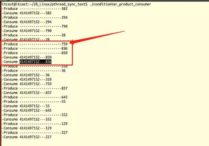 //可以为if吗 不可以否则多个消费来临时阻塞在条件变量,当生产者生产一个数据而被唤醒全部,数据不够分导致访问错误