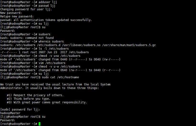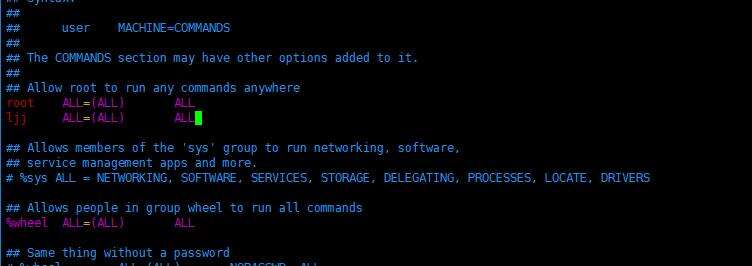 把ljj用户添加进去,ljj用户就可以使用sudo命令了,但是每次使用sudo命令都需要输入密码,如果不想输入密码,最后一个ALL更改为NOPASSWD: ALL,这样使用sudo的使用就会无密码操作了,极为不安全,哈哈。
