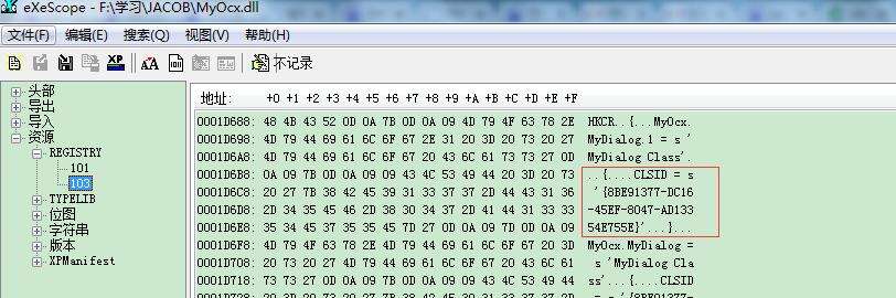 打开查看MyOcx.dll文件,其中关注下这个CLSID值,如下图: