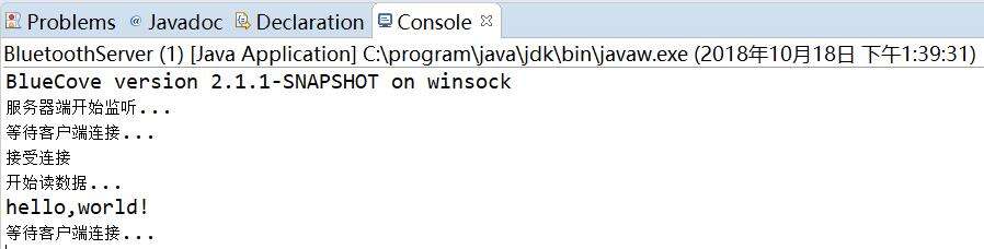 * 蓝牙的服务器端。部署在Windows操作系统(PC电脑上)。 等待手机客户端或者其他蓝牙设备的连接。 该代码文件是一个Java