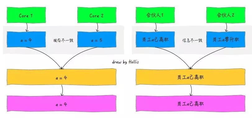 比如,合伙人1要辞退员工a,合伙人2要给员工a升职,升职后的话他再被辞退需要多个合伙人开会决议。两个合伙人分别把命令下发给了自己的管理人员。合伙人1命令下达后,管理人员a在辞退了员工后,他就知道这个员工被开除了。而合伙人2的管理人员2这时候在没得到消息之前,还认为员工a是在职的,他就欣然的接收了合伙人给他的升职a的命令。