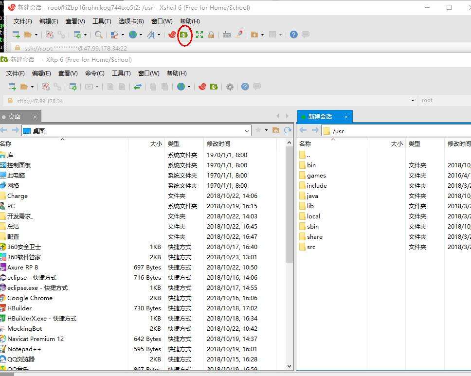 点击后就会出现这种可视化的文件上传工具,当然是需要下载的,左侧为当前电脑内所有的文件,右侧就是服务器里面的文件。选中后即可上传,上传成功后,建议建立一个新的文件夹来存放你的java文件