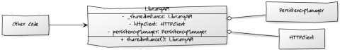 执行这个模式,只有 LibraryAPI 来保存 PersistencyManager 和 HTTPClient 的实例。之后,LibraryAPI 将会公开一个简单的 API 来访问这些服务。